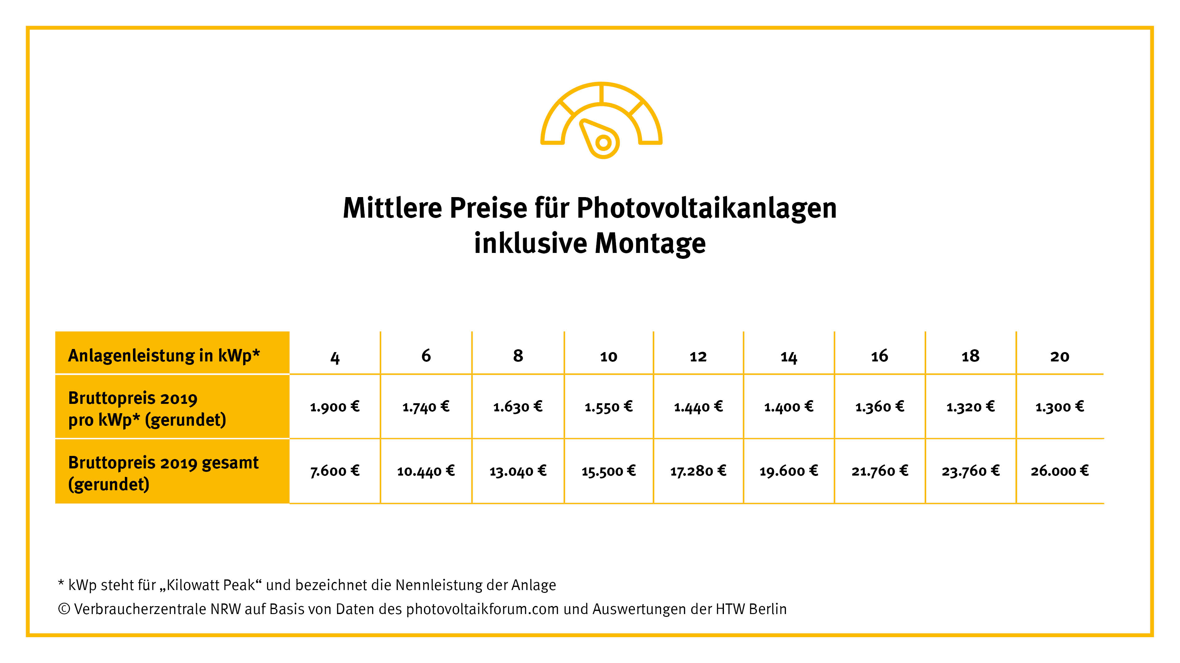 Tabelle "Mittlere Preise für PV-Anlagen inklusive Montage"